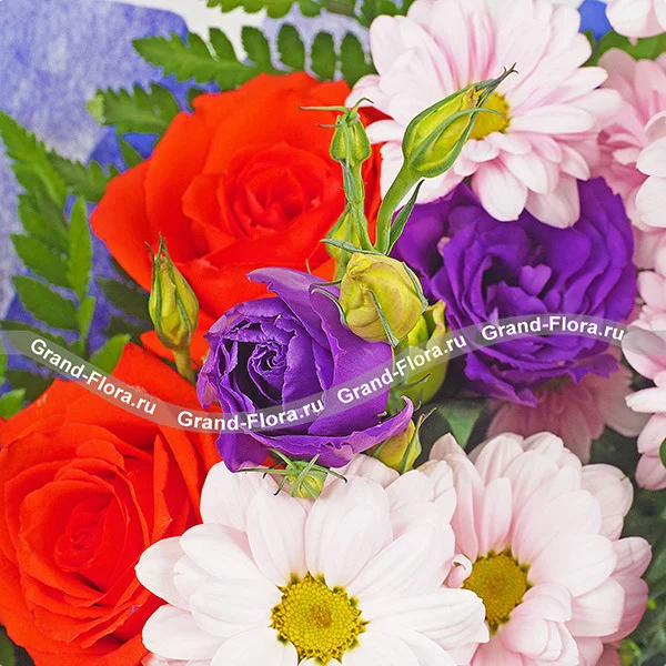 Стандартный (на фото): роза красная - 3 шт., хризантема кустовая светло фиолетовая - 2 шт., эустома фиолетовая - 2 шт., папоротник - 5 шт., фетр синий, бант красный.