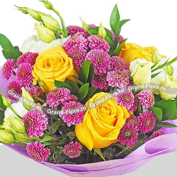 Букет выполнен из ярких желтых роз, с яркими акцентами фиолетовой кустовой хризантемы сантини  и кульминацией в виде эустомы, свободно расположенной по периметру букета. Завершает композицию фиолетовый фетр. Диаметр букета от 25 см до 45 см,в  зависимости от выбранного Вами варианта букета. Высота букета от 40 см. Обращаем Ваше внимание, что состав и оформление букета могут отличаться.