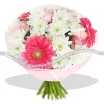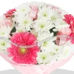 хризантема кустовая белая - 6 шт., гербера розовая - 5 шт., фетр розовый, лента.