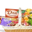 Стандартный: роза кустовая (микс) 20 см - 5 шт., конфеты "DOVE Promises" - 1 шт., шоколад "Milka" - 1 шт., Twix - 3 шт., чай "Greenfield" - 1 шт., печенье "Alpen Gold" - 1 шт., декоративная зелень, оазис, корзина средняя.