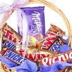 ЛЮКС: роза красная (70 см) - 1 шт., Twix - 4 шт., Snikers (маленький) - 4 шт., Picnic - 2 шт., шоколад "Milka" - 2 шт., декоративная зелень, корзина малая, фетр фиолетовый, бант сиреневый.