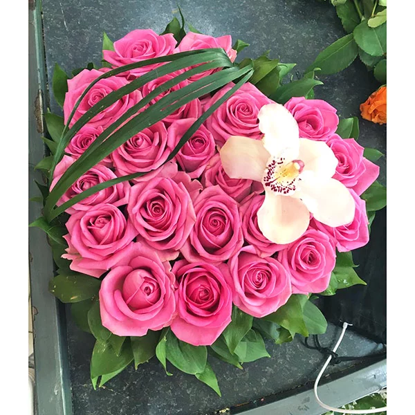 Люкс: роза розовая - 22 шт., орхидея белая - 1 шт., декоративная зелень., декор., оазис.