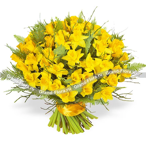 Стандартный: нарциссы - 51 шт., декоративная зелень, лента желтая.