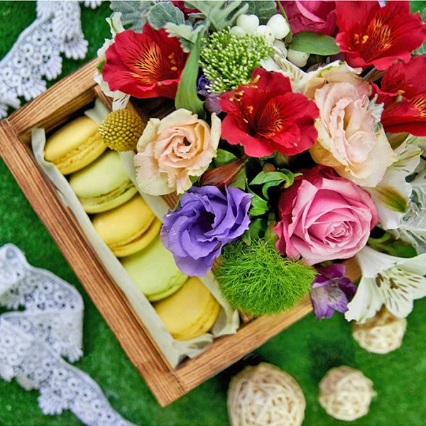 Стандартный: роза розовая - 3 шт., эустома фиолетовая - 1 шт., эустома белая - 1 шт., альстромерия красная - 1 шт., альстромерия белая - 1 шт., декоративная зелень,  макаруны, оазис, деревянная коробка.