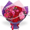 Уменьшенный: роза красная - 1 шт., роза кустовая красная - 2 шт., роза кустовая розовая - 2 шт., хризантема кустовая ромашковая розовая - 2 шт., декор, упаковка, лента. Примерный размер: 20Х20 см.