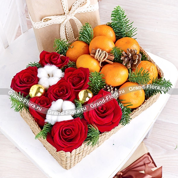 Стандартный: роза красная - 7 шт., хлопок - 2 шт., шарики - 2 шт., ель, мандарины - 1 кг., шишка - 1 шт., корица - 1 шт., оазис, корзина.